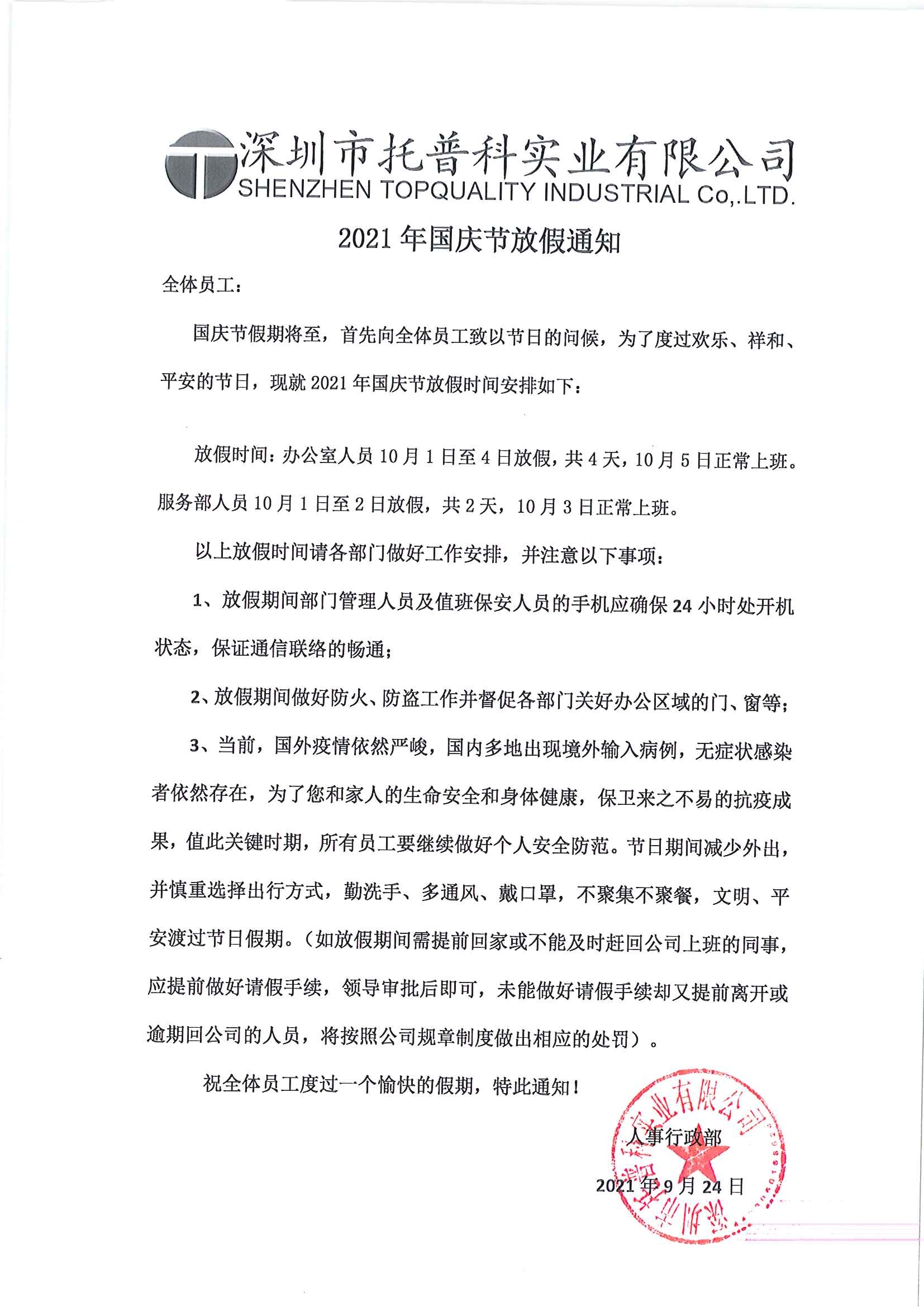 深圳托普科2021國慶節(jié)放假通知