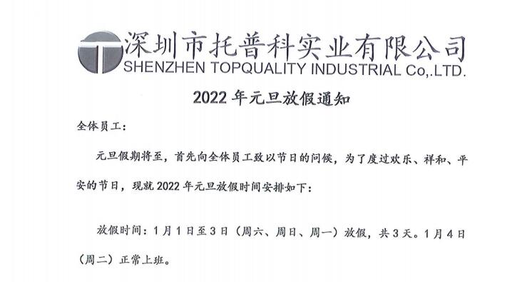 托普科實(shí)業(yè)2022元旦放假通知