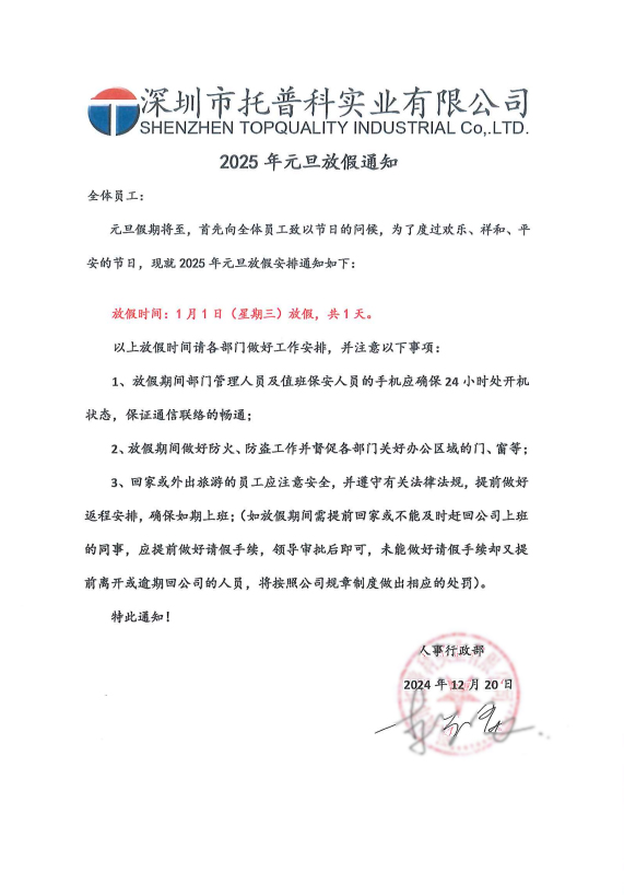 祥龍賀瑞辭舊歲,玉兔回宮迎新年!值此元旦佳節(jié)來臨之際,根據(jù)國家法定節(jié)假日規(guī)定,并結合本公司實際情況,現(xiàn)將元旦放假安排通知如下: